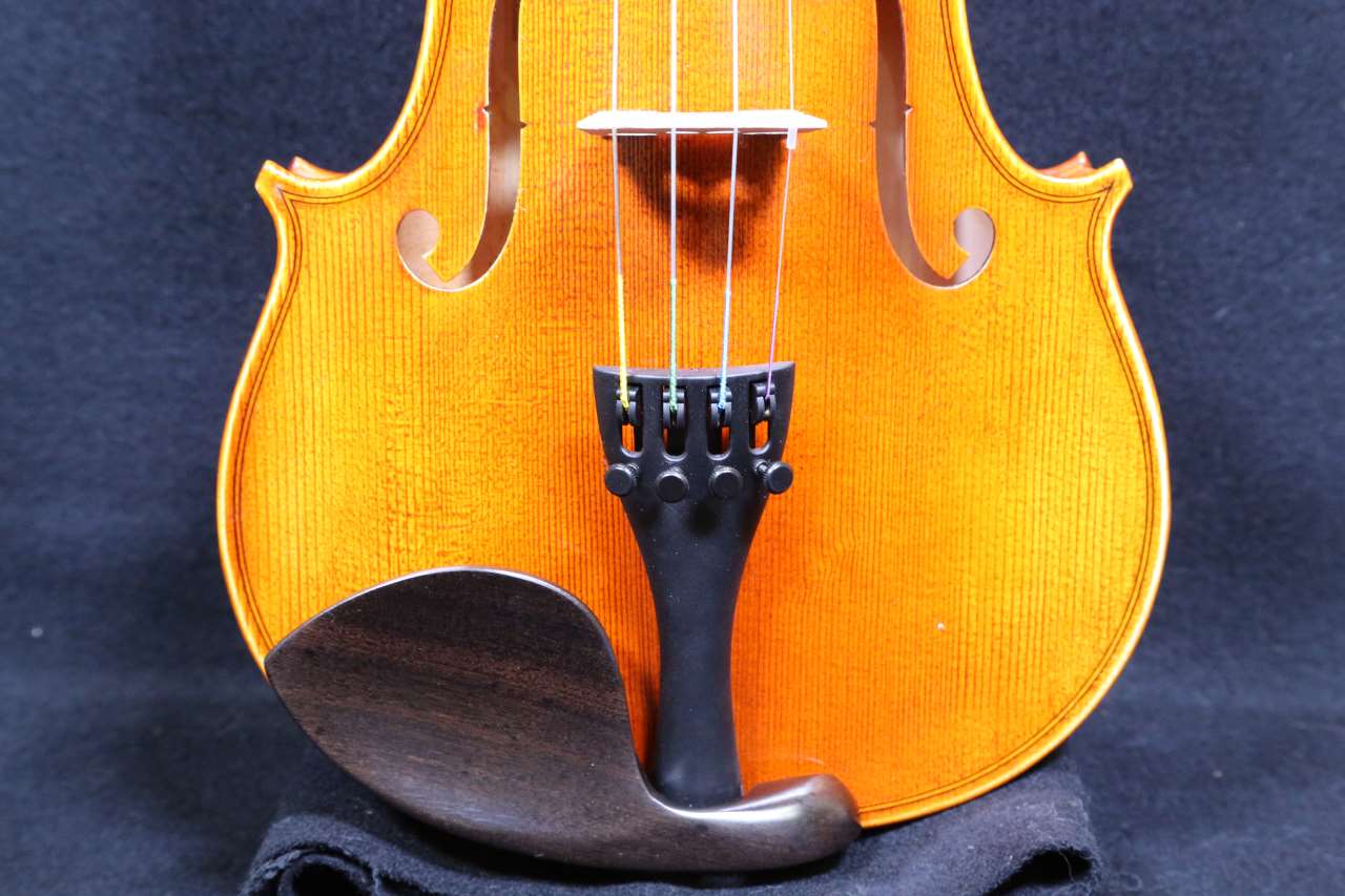 このバイオリンは黒檀のフィンガーボード、エボニーのアゴ当て・ペグとテールピースを含んでいます。