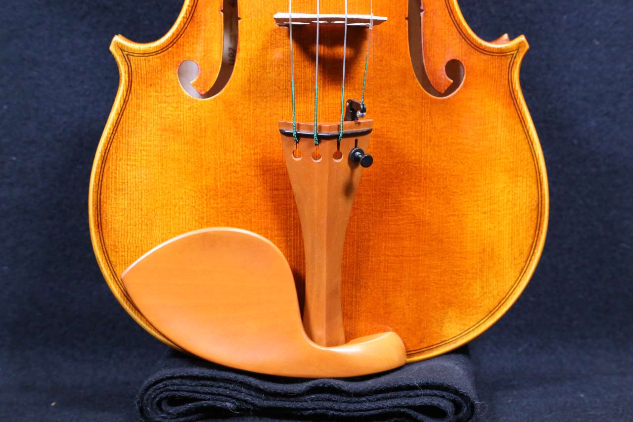 このバイオリンは黒檀のフィンガーボード、紫檀(ローズウッド)のアゴ当て・ペグとE線アジャスター・テールピースを含んでいます。