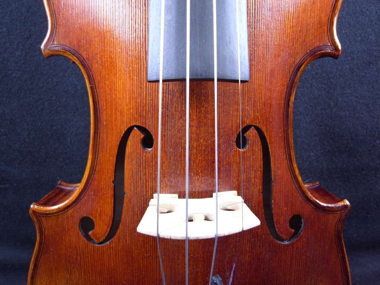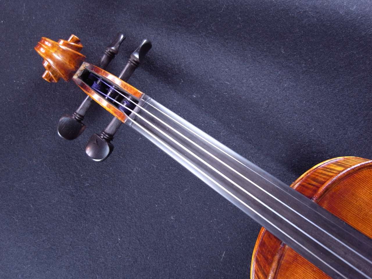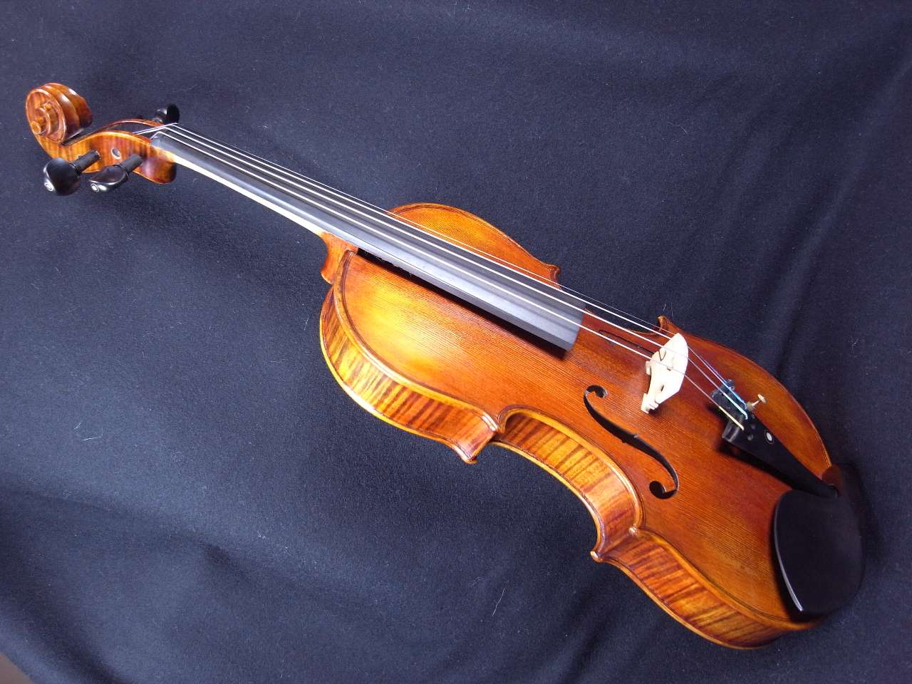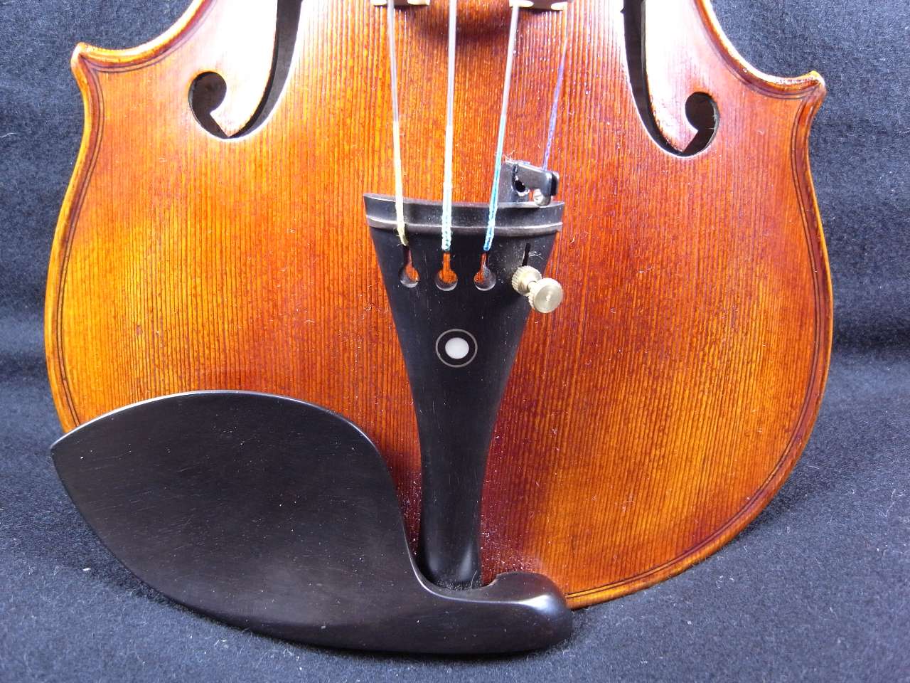 このバイオリンは黒檀のフィンガーボード、最高級黒檀材のアゴ当て・ペグ・テールピースを含んでいます。