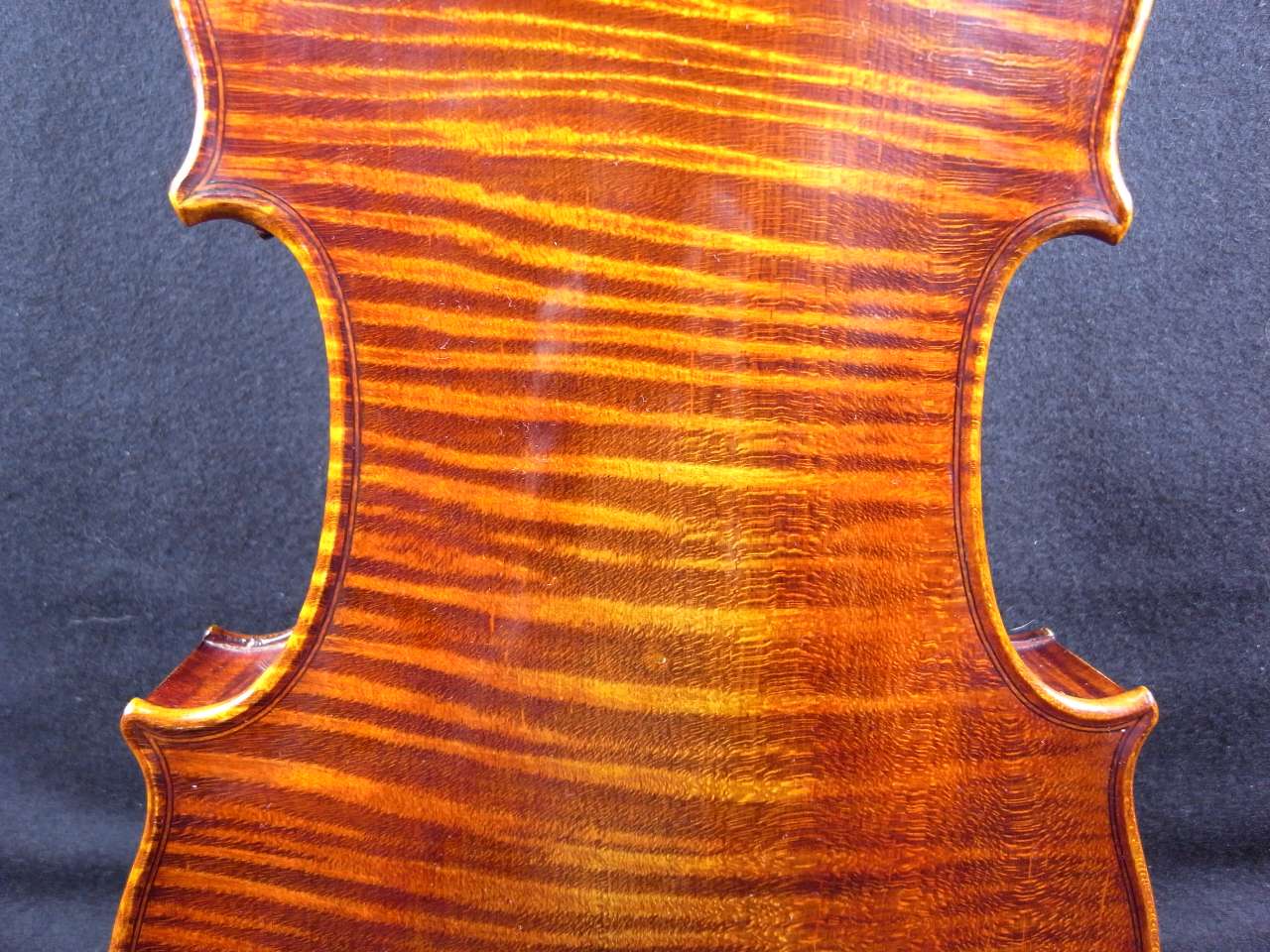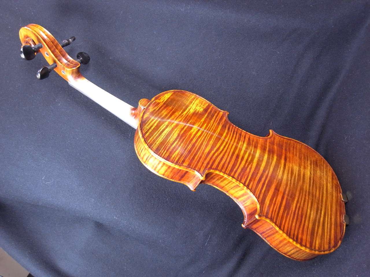 12年間自然乾燥熟成した高品質のカーリーメープルとスプルースの単板から手工削り出しによって作られています。非常に素晴らしいトラ目のカーリーメープルを使用し完全ハンドメイドで優れた外観もさることながら非常にしっかりとした作りです。国産品に比べ大変コストパフォーマンスが良いと好評を頂いております。