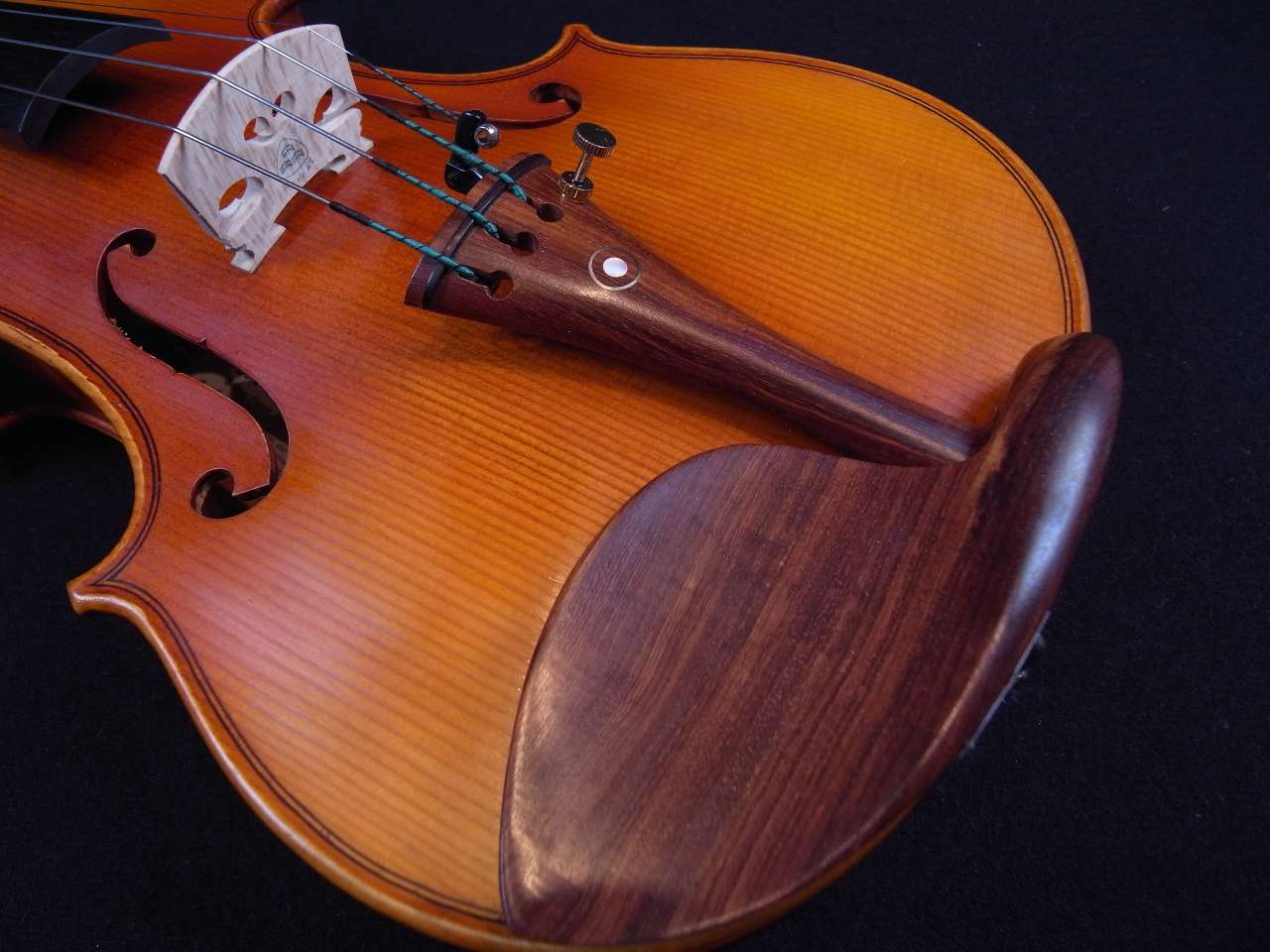 このバイオリンは黒檀のフィンガーボード、最高級赤紫檀(レッドローズウッド)のアゴ当て・ペグ・テールピースを装備。